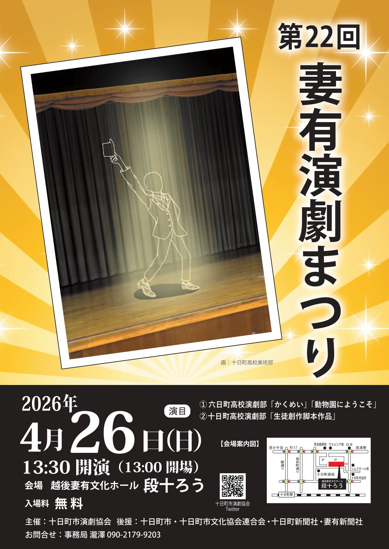 お知らせNEWS 2026年01月27日 お知らせ 段十ろうをご利用の皆さまへ(駐車場利用について) 2026年04月14日 公演情報 2026年度 だんだんテラスコンサート開催のお知らせ 2026年03月07日 公演情報 段十ろう寄席 林家たい平独演会 開催について 2026年02月04日 お知らせ 越後妻有文化ホール・十日町市中央公民館「段十ろう」施設の利用者満足度調査結果について 2026年01月29日 休館情報 駐車場排雪作業に伴う休館のお知らせ ⇨過去一覧 本日のイベントToday's Information 本日のイベントはありません。 公演・イベント情報Performance & Event information 2026年5月17日 越後妻有文化ホール 【共催事業】Keizo Nakanishi 35th Anniversary Project 『Evergreen』中西圭三with宮本貴奈 2026年7月4日 越後妻有文化ホール 【共催】段十ろう寄席 林家たい平独演会 2026年4月26日 越後妻有文化ホール 第22回 妻有演劇まつり 2026年5月3日 越後妻有文化ホール 令和8年度 十日町市二十歳のつどい 2026年5月10日 (十日町市中央公民館)だんだんテラス ギター&フルートおさらい会 2026年5月16日 越後妻有文化ホール Coro+Gioia 第1回定期演奏会 2026年5月31日 越後妻有文化ホール 吹奏楽部第56回定期演奏会 2026年6月4日 越後妻有文化ホール 昼:夢スター春・秋 夜:石田社長「私のおススメ」夢コンサート 段十ろう 紹介Movie アクセスAccess ホール全景 ホール全景 ホール全景 ホール客席 ホール客席横 ステージ正面 ステージ背面 花道下袖 花道上袖 緞帳 ホール間接照明 アーティストラウンジ ホール控室 楽屋1 楽屋2 楽屋3 楽屋4
