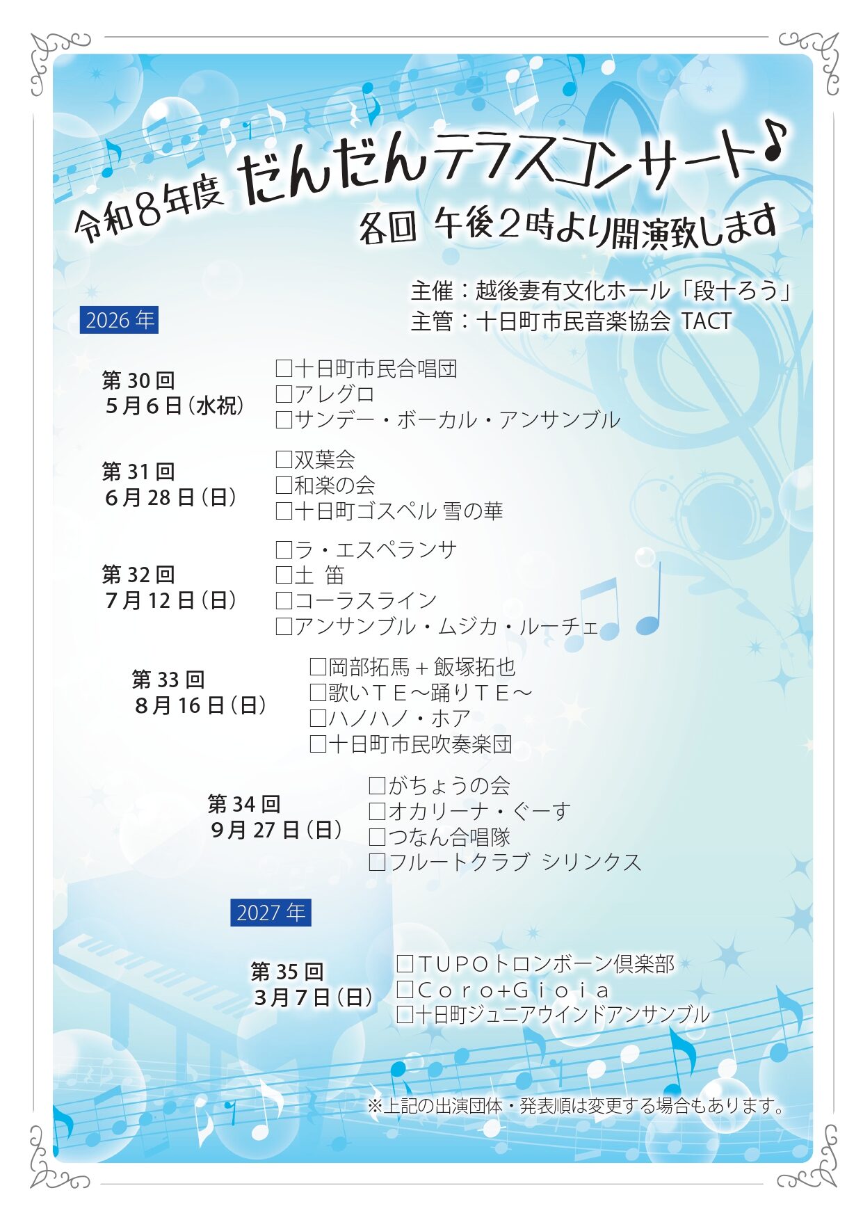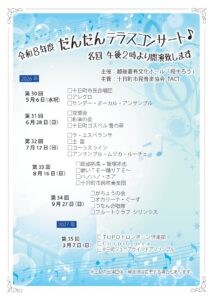 十日町市越後妻有文化ホール「段十ろう」では、今年度も地域のみなさまに気軽に音楽を楽しんでいただける 「だんだんテラスコンサート」 を開催いたします。 本コンサートは、だんだんテラスを会場に、季節ごとに多彩なアーティストが出演する無料の音楽イベントです。 お買い物やお散歩の途中に、どなたでも自由にお立ち寄りいただけます。