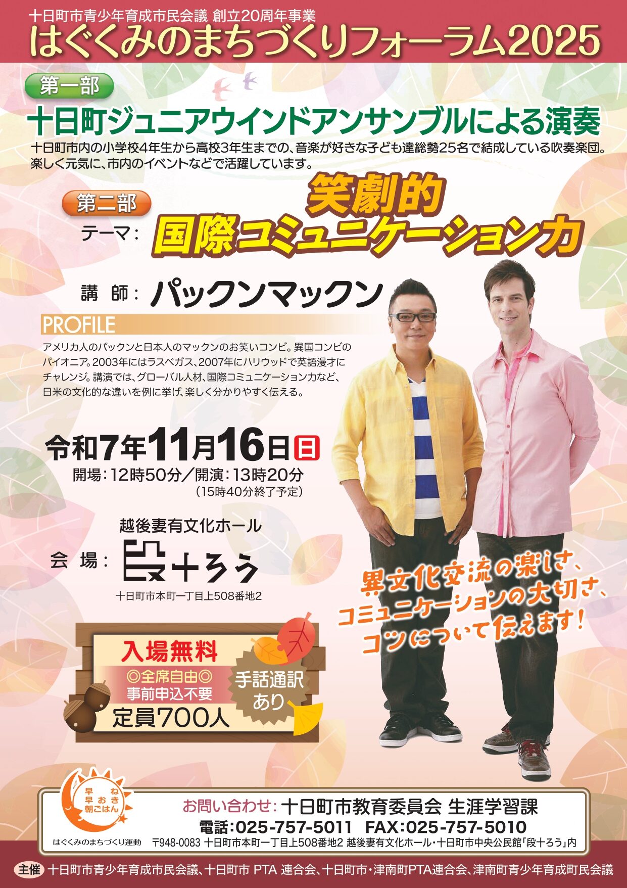 イベント詳細 会場: 越後妻有文化ホール 【 はぐくみのまちづくりフォーラム2025 】 ■公演日時 2025年11月16日(日) 開演13:20(開場12:50) 終演15:40予定 ■全席自由 ■入場無料 事前申込不要 ■主催 十日町市青少年育成市民会議、十日町市PTA連合会、十日町市・津南町PTA連合会、津南町青少年育成町民会議 ■問合せ 十日町市教育委員会生涯学習課 025-757-5011