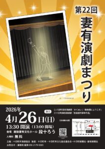 イベント詳細 会場: 越後妻有文化ホール 【第22回 妻有演劇まつり】 ■公演日時 2026年4月26日(日) 13:30開演 (13:00開場) ■料金 無料 ■出演 六日町高校演劇部 十日町高校演劇部 ■主催/十日町市演劇協会 ■お問い合わせ/事務局 瀧澤 090-2179-9203