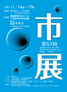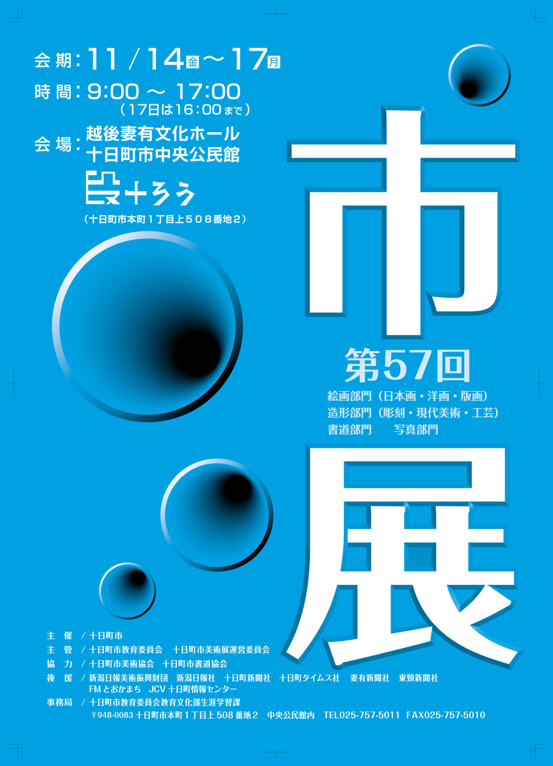 イベント詳細 会場: 十日町市中央公民館 【 第57回 十日町市美術展 】 ■開催日時 11月14日㈮~11月16日㈰ 9:00~17:00 最終日は16:00まで ■表彰式 11月16日㈰ 9:00~9:30 ■主催/お問合せ 十日町市教育委員会 生涯学習課 025-757-5011